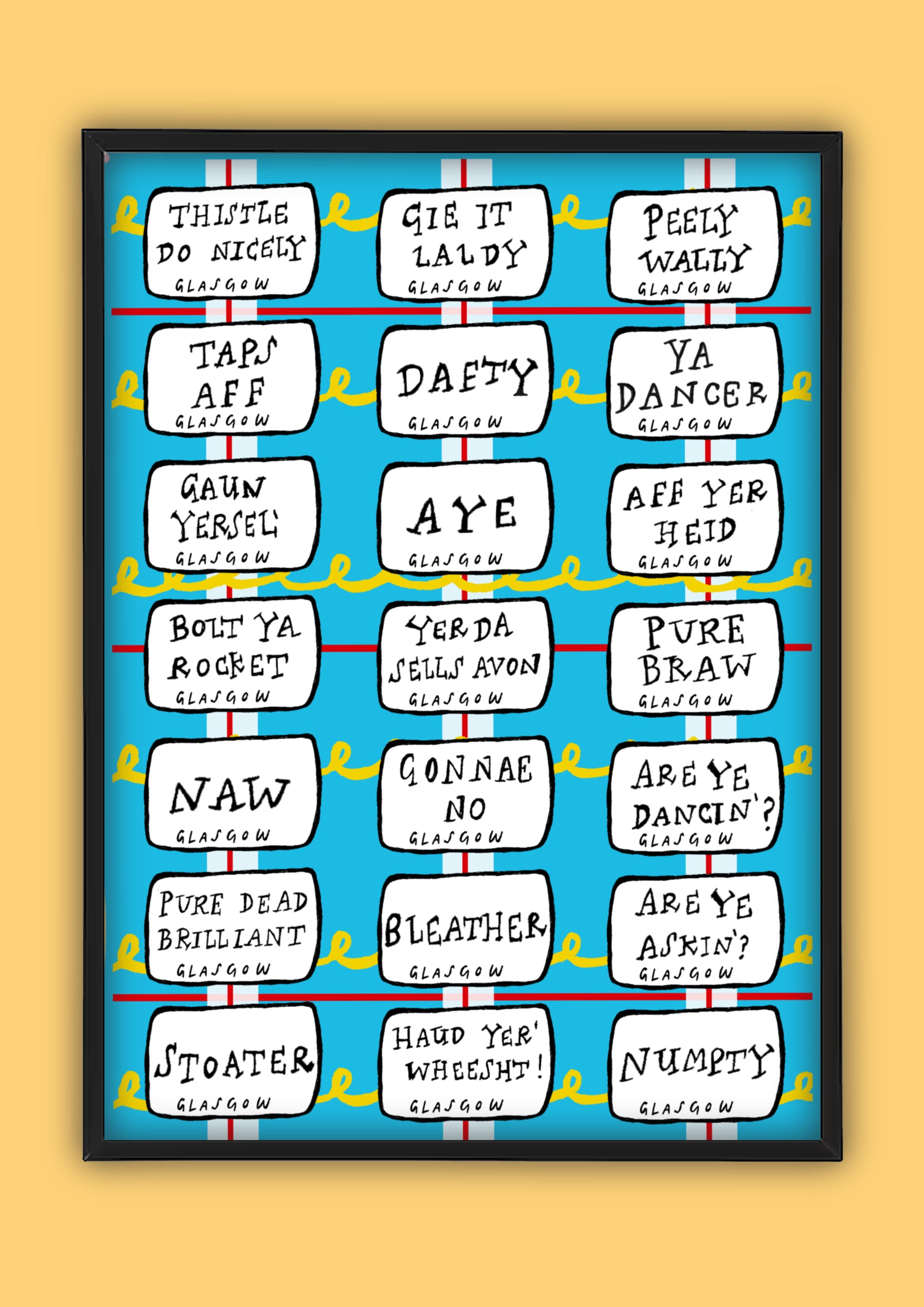 Glasgow Slang Street Signs Illustration, a fun vibrant print with some of Scotland's best slang!